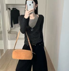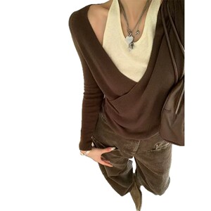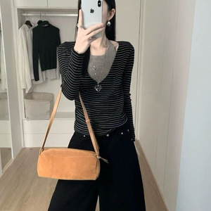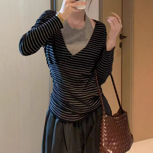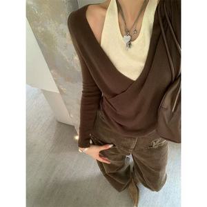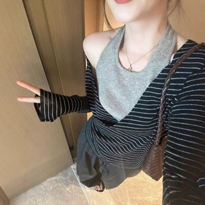 法式气质条纹挂脖假两件长袖针织衫女秋装新款慵懒高级感修身上衣