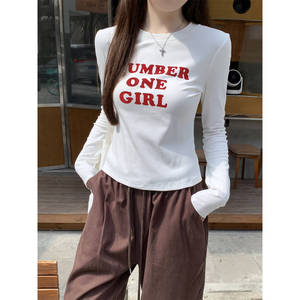 甜酷风字母印花圆领修身打底上衣女秋季正肩显瘦长袖百搭短款T恤