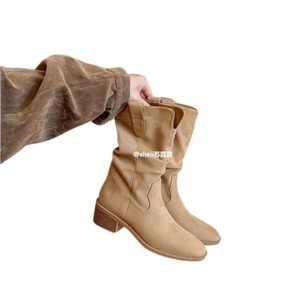 牛皮版 敦煌靴~秋冬新款V扣褶皱粗跟内增高沙漠堆堆短靴女西部靴