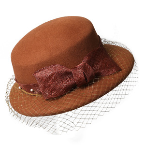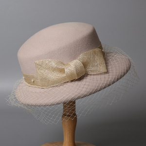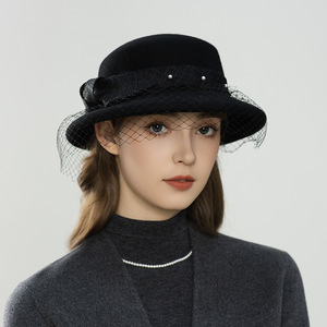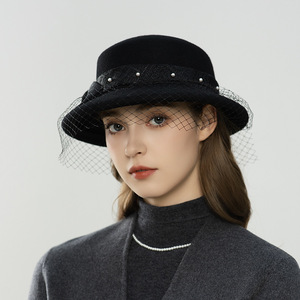 秋冬季新款澳洲羊毛网纱珍珠蝴蝶结装饰盆帽优雅气质女士帽子批发