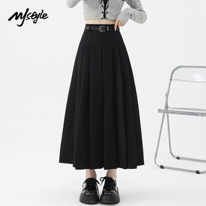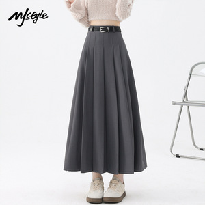 MJ STYLE灰色百褶西装裙女秋半身裙高腰休闲大摆a字过膝中长裙