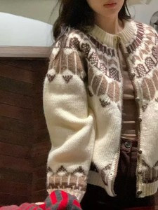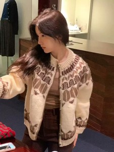 几何图案针织开衫上衣女韩国圆领秋冬保暖单排扣甜美百搭毛衣外套