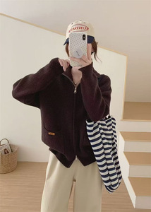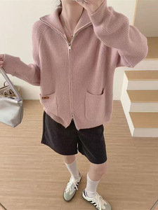 秋冬新款韩系宽松纯色立领针织开衫百搭简约款拉链休闲毛衣女外套
