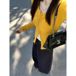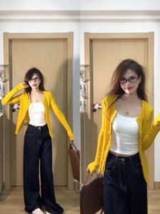 韩系氛围感穿搭黄色圆领长袖开衫女秋装修身显瘦别致针织外套上衣
