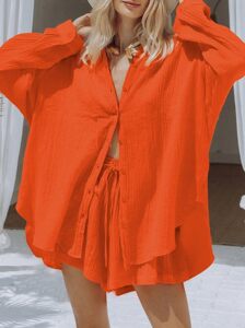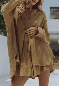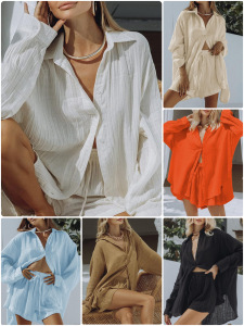 欧美女式休闲两件套2025年夏季新款长袖衬衫上衣和短裤运动服套装