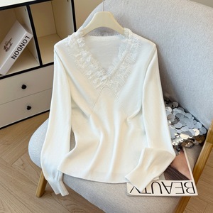 设计感蕾丝拼接V领长袖针织衫女上衣2025早秋新款内搭打底衫毛衣