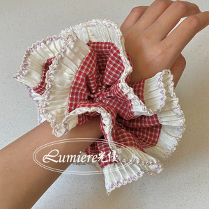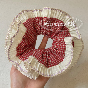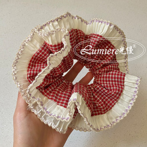法式红格子褶皱风琴边大肠发圈气质明媚少女丸子头花新款马尾发绳