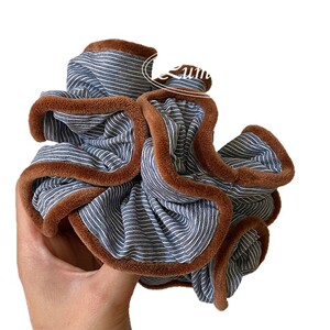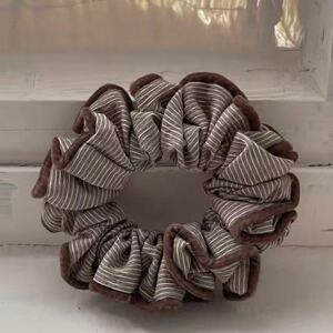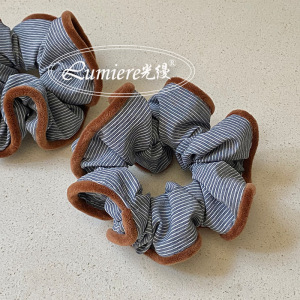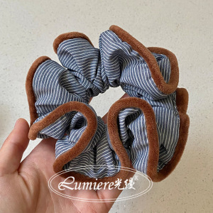 小众复古设计蓝咖配色大肠发圈棕色丝绒包边蓝条纹褶皱小肠圈新款