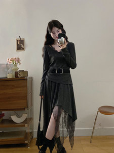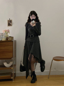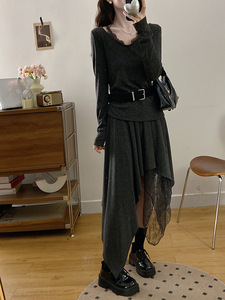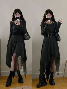 2025年大码女装法式慵懒风蕾丝拼接上衣设计感不规则显瘦长裙套装