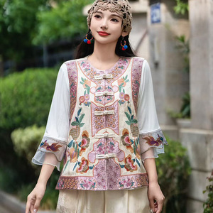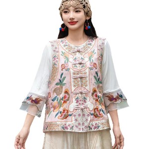 2025秋季新款圆领单排扣无袖马甲纯色民族风刺绣缎面提花马甲外套