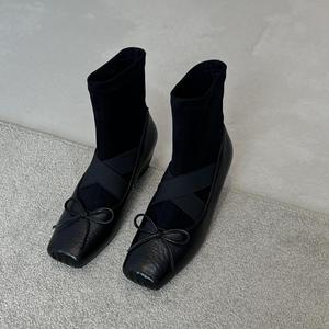 羊皮版~2025新款复古风方头粗跟弹力靴女款交叉绑带芭蕾舞鞋短靴