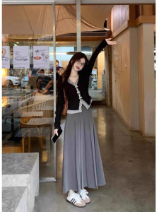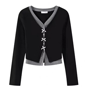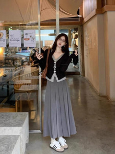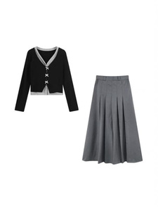 假两件短款蝴蝶结韩系修身长袖针织衫百褶半身长裙女早秋休闲套装