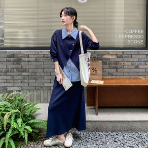 实拍假两件条纹拼接上衣两件套2025秋款时尚高腰半身裙气质套装