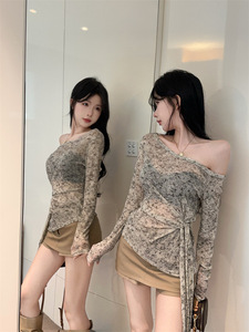 不规则斜肩长袖t恤女秋季辣妹一字肩绑带收腰上衣巨好看防晒罩衫