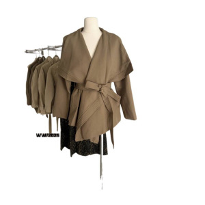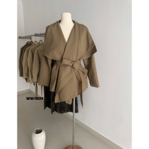 塞纳2025新款卡其色短款风衣 荷叶领短款大翻领风衣外套气质大衣