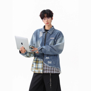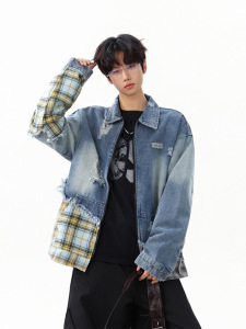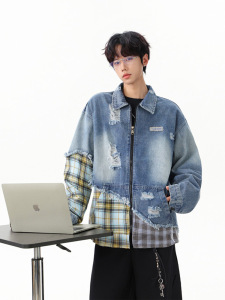 美式格子拼接牛仔外套男新款复古设计休闲夹克潮牌破洞高街牛仔衣