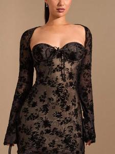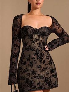 跨境亚马逊欧美女装时尚优雅圆领长袖网纱拼接紧身包臀连衣裙