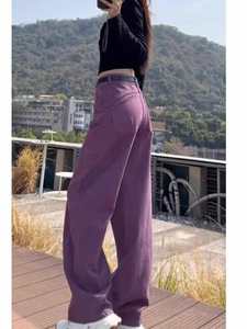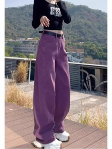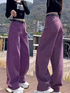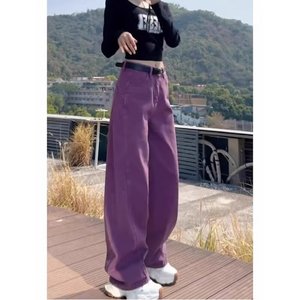 美式复古紫色阔腿牛仔裤女春秋新款大码胖mm百搭宽松显瘦直筒裤子