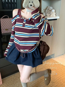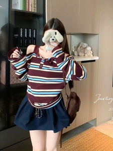 韩系撞色条纹拼接一字肩长袖T恤女2025秋季新款心机小众别致上衣
