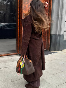 时尚气质翻领麂皮绒双排扣宽松长款大衣女2025秋冬新款跨境欧美风