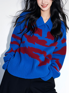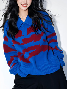 新款慵懒风超好看内搭上衣宝蓝色撞色polo领宽松加厚针织毛衣女秋