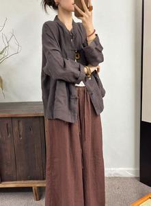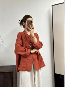 新中式女装高品质亚麻上衣女纯色文艺复古对襟衬衫女中式改良茶服