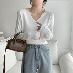 百搭针织打底衫秋季韩版v领宽松内搭套头纯色毛衣女长袖显瘦上衣