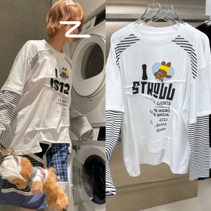 小众设计韩版宽松条纹拼接长袖T恤女休闲百搭 25秋新款设计感上衣
