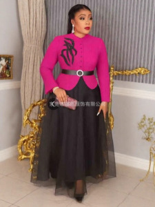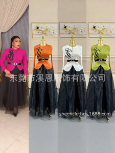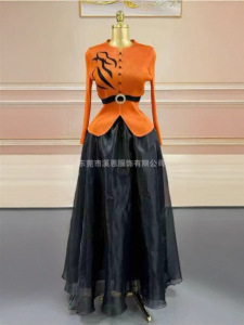 Miyaki新款三宅圆领褶皱长袖女装欧根纱半身长裙礼服两件套大码跨