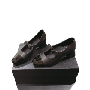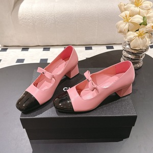 外贸新款小香风真皮方头浅口拼色中跟cc蝴蝶结扣带玛丽珍鞋单鞋女