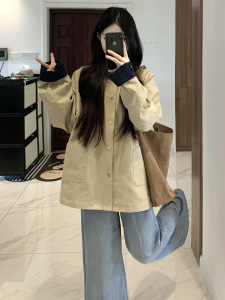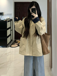 2025新款韩系小个子减龄拼接时尚单排扣卡其色风衣翻领夹克外套女