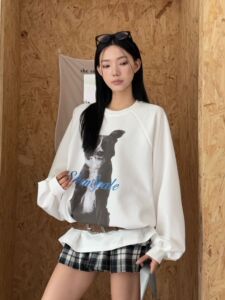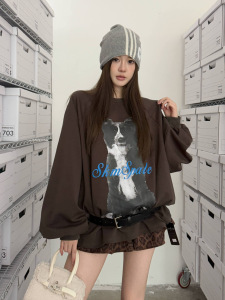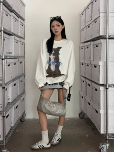 ME KAKAMEE十三行秋美式趣味小狗喷画插肩袖大版圆领卫衣女 S3652