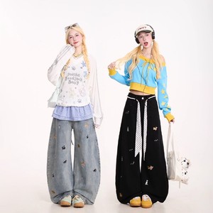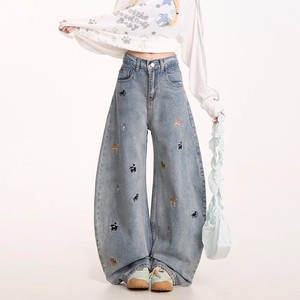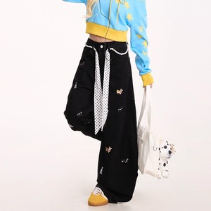 大码女装黑色趣味小狗刺绣直筒牛仔裤女胖mm美式复古显瘦阔腿裤子