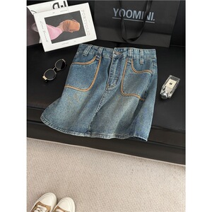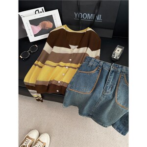 深圳南油两件套早秋港风复古撞色条纹V领针织开衫牛仔短裙套装女