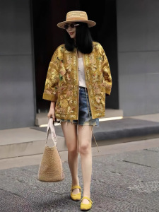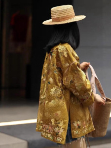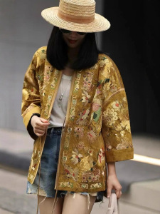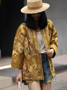 深圳南油原创高端巨重工满绣金黄缎真丝外套中式国风刺绣花鸟复古