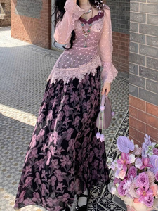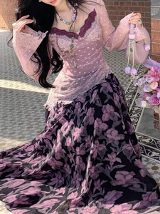 法式气质浪漫紫萝秋季新款温柔甜美假两件上衣碎花半身裙套装女
