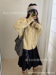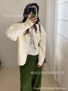 以时 秋冬新品韩系针织外套女 立体毛球圆领粗针毛衣外套女
