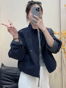 韩系立领格子拼接外套女2025秋装新款设计感小个子休闲夹克上衣潮