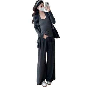 孕妇秋季新款休闲时尚开衫挂脖打底背心休闲阔腿裤甜美显瘦套装