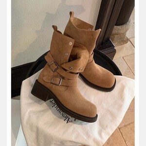 牛皮版~葡萄妈同款增高秋日美拉德翻折两穿扣带牛反绒牛仔中筒靴