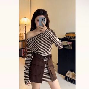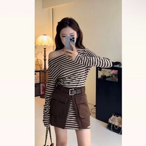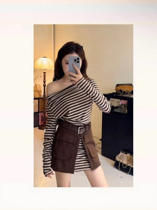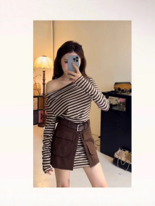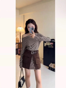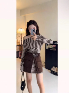抖音网红同款辣妹一字肩条纹上衣+高腰工装半身裙封腰叠穿两件套