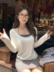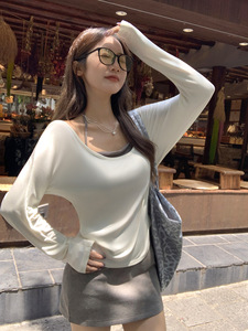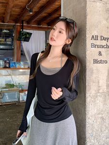 韩系简约纯色褶皱低圆领长袖内搭t恤打底衫2025秋季新款收腰上衣