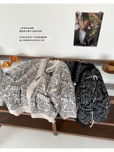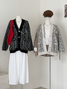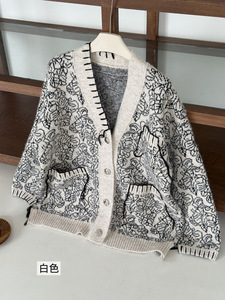 老钱风手工穿绳撞色V领针织开衫女秋冬新款宽松中长款毛衣外套潮
