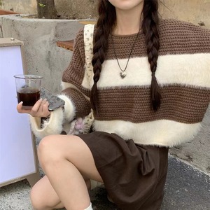毛衣女复古宽松针织衫秋季感女装撞色拼接新款设计仿貂毛软糯条纹