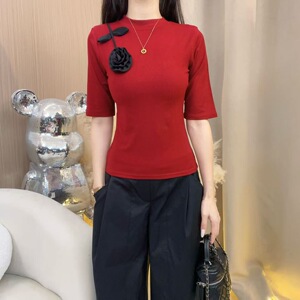 2025早秋法式领口花朵装饰常规款圆领中袖时尚显瘦休闲纯色女9088