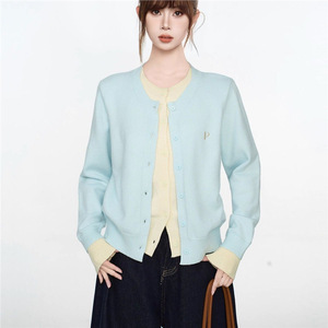 蕾朵蓝色假两件长袖针织开衫女早秋季高级感撞色毛衣外套韩系上衣