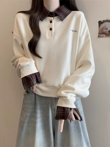 格子衬衫拼接假两件卫衣女款秋冬大码胖mm显瘦宽松韩系Polo领上衣
