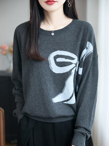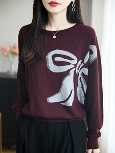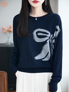 百搭蝴蝶结提花针织衫女圆领减龄宽松打底衫上衣精纺细毛长袖毛衣