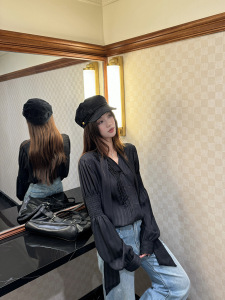 实拍 2025秋季韩版V领衬衫女秋季新款丝带设计高级感时尚长袖衬衣