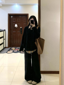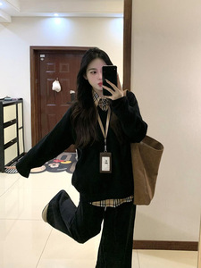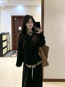美式高街oversize黑色撞色假两件卫衣女春秋慵懒秋冬长袖上衣外套